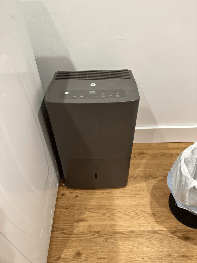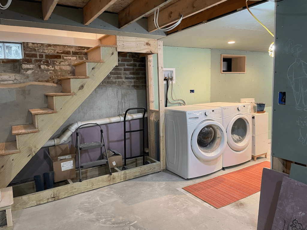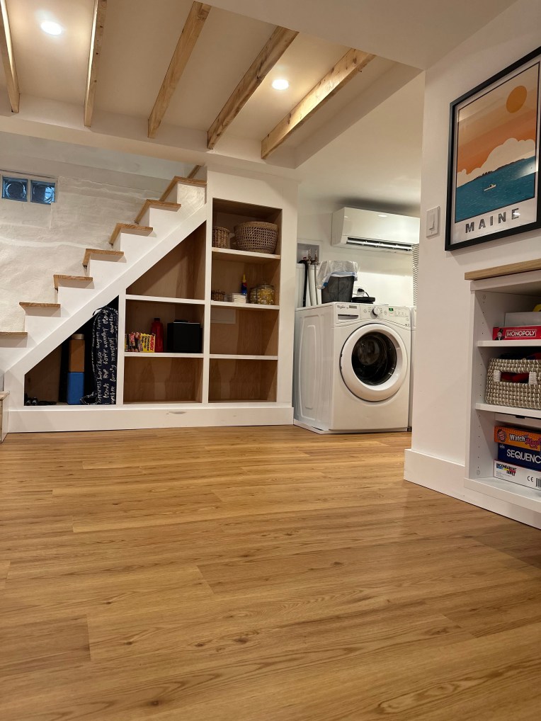 One last note. If you finish your basement, get a self-draining dehumidifier. I don’t know what the basement would be like without it because we’ve had it from the start, but I can attest that it has never felt the least bit moldy or damp: