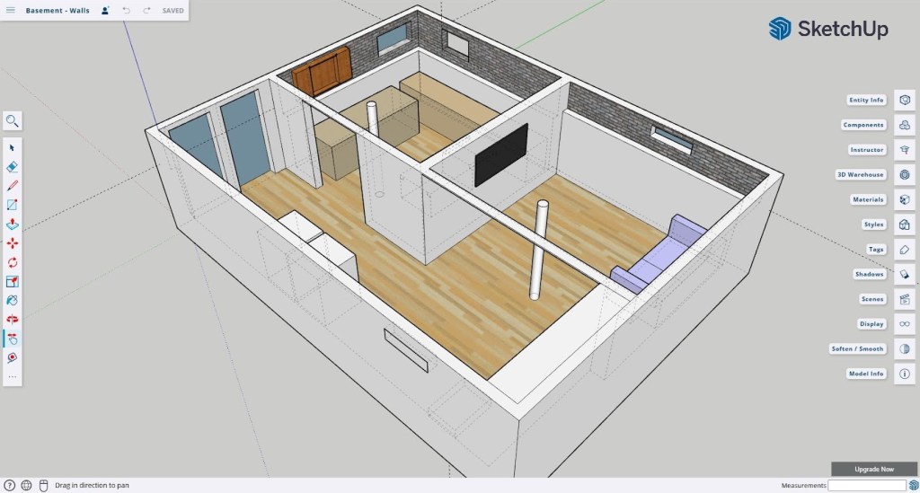 In our case, we wanted three main areas: a den, a workshop, and a laundry. The constraints were three columns, some glass block windows, sewer lines around the perimeter at various heights, and a staircase.