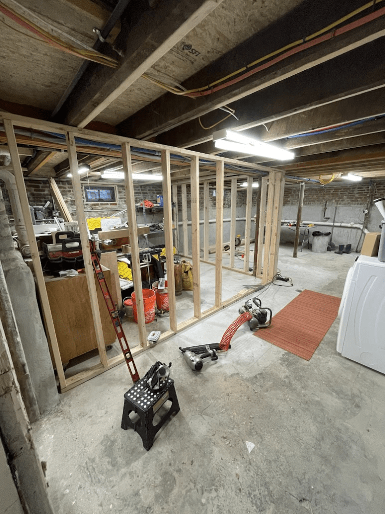 Picking the right starting wall is important as a reference point, and there are all sorts of YouTube videos for getting your walls square. In my case, I began with the wall that separated the den from the workshop, because I knew I could simply line this up with the floor joists above, and use it as a reference for the other walls. Here’s the beginning of that wall: