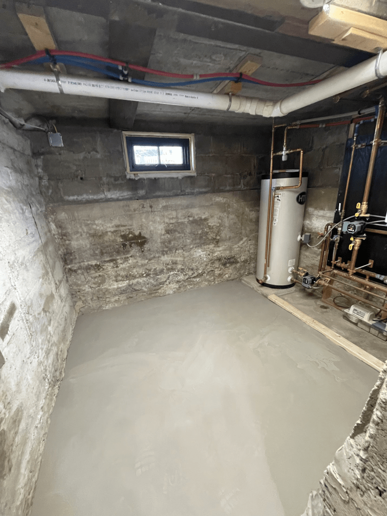 The next step was to fix up the floors. This meant patching a few bare dirt spots with concrete and then getting it reasonably smooth and flat. In this step, I fell in love with self-leveling underlayment. But I get ahead of myself. As I said, the first step was patching bare dirt spots with concrete. You can see one patch in the lower-right corner of the picture above, where the water main is coming up.