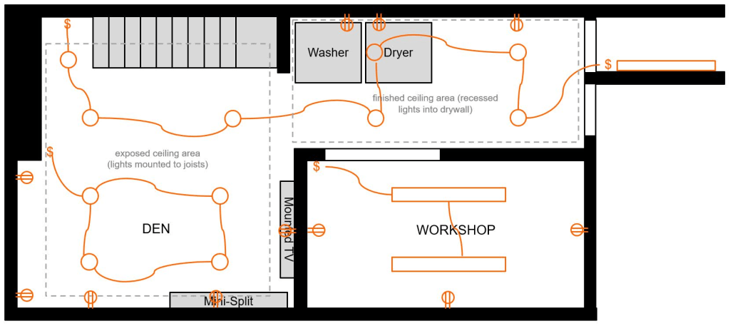 This was the second thing for which we hired professionals. I took one look at the “Black and Decker Complete Guide to Wiring” and my woodworker’s brain shut down. I did at least provide them with this diagram after learning the little symbols for outlets and light switches: