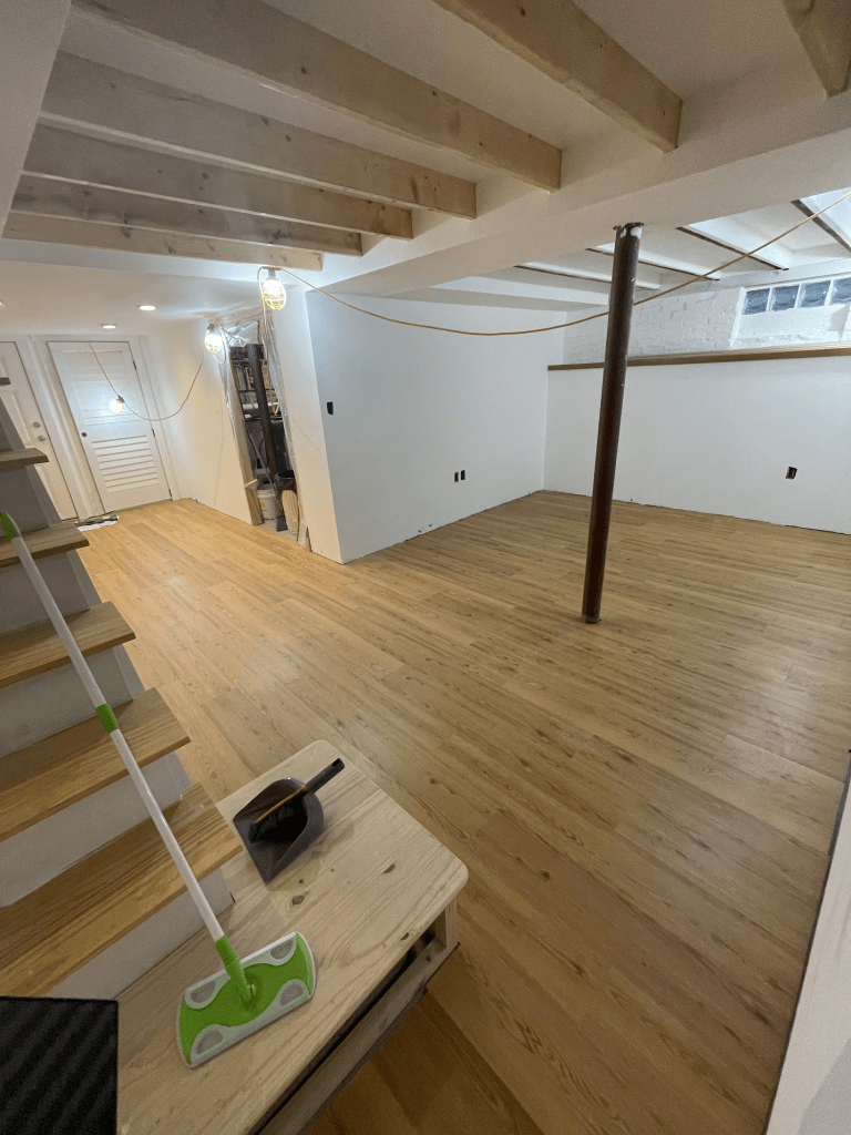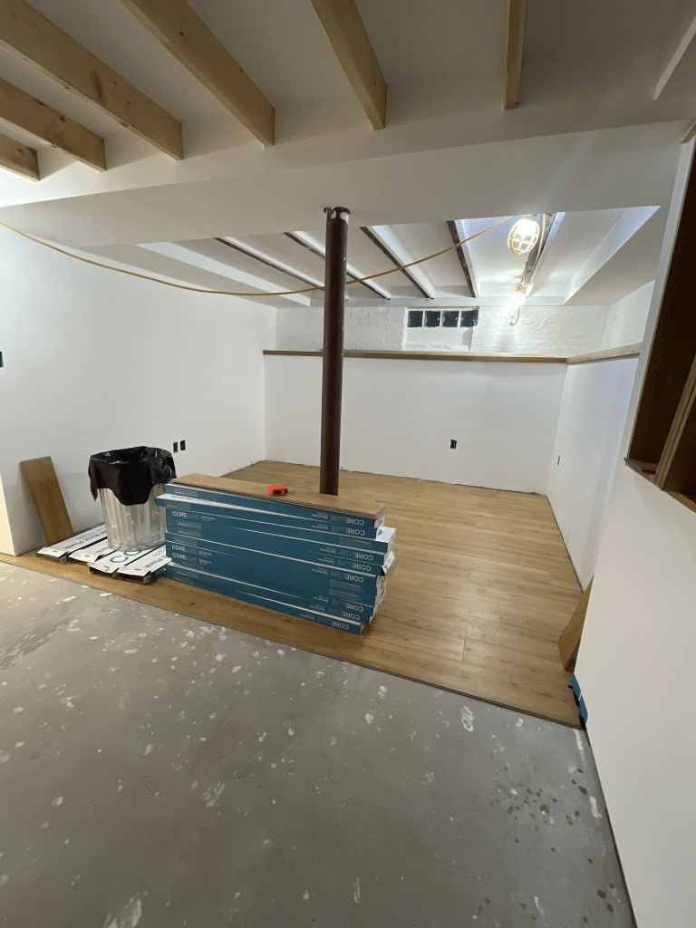 Things really come together when the floor goes down. We choose a wood-look LVP (luxury vinyl plank), sticking with the oak theme to match the built-ins, with a good cushion to try to mask any imperfections. Here it is in progress:
