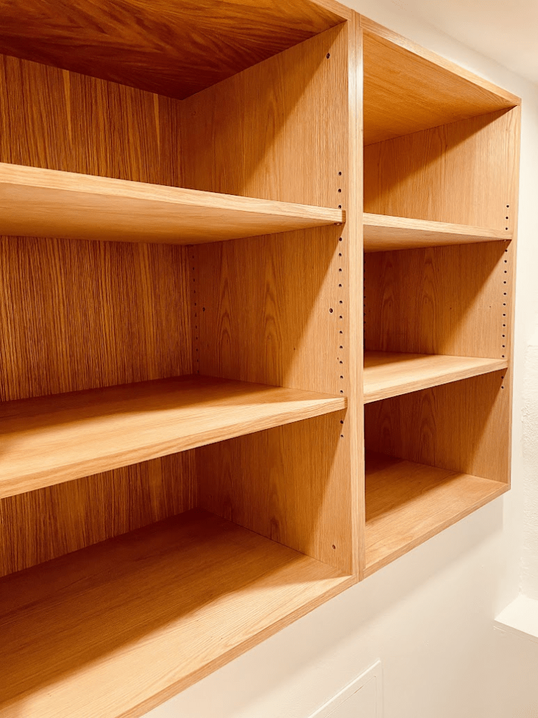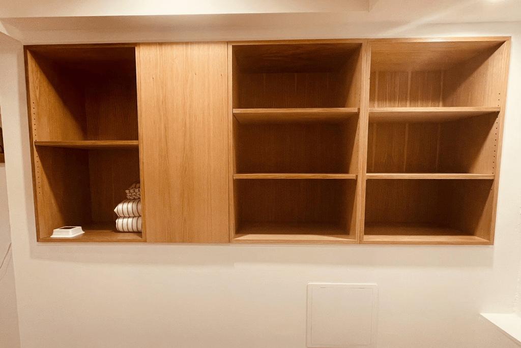 And here’s the result: four white oak cabinets with open shelves and the water main behind a door:
