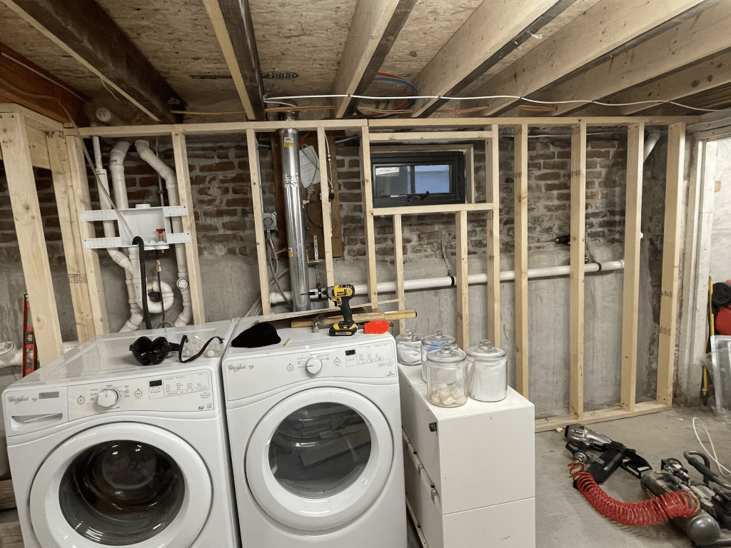 As a woodworker, I knew I didn’t want boring IKEA cabinets for storage. I wanted custom-fit built-ins. Knowing this in advance allowed me to frame things with the built-ins in mind. I made two sets. The first set was a group of cabinets to occupy the unused space above the sewer line and to hide the water main. Here’s the initial framing: