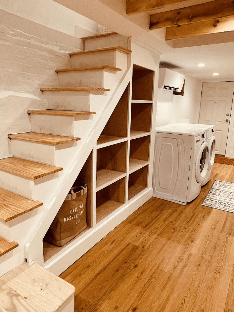 The second set of built-ins was about making the most of that tricky under-stairs area. I iterated on a few ideas for this one, including closed cabinets, drawers, and so on, but landed on the simplicity and airiness of open shelves, which I recommend for a basement. Again, here’s the framing — pretty simple, in this case, comprising just some pressure-treated 2x6s set level on the decidedly unlevel floor and a few studs along the right side: