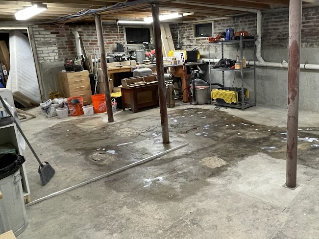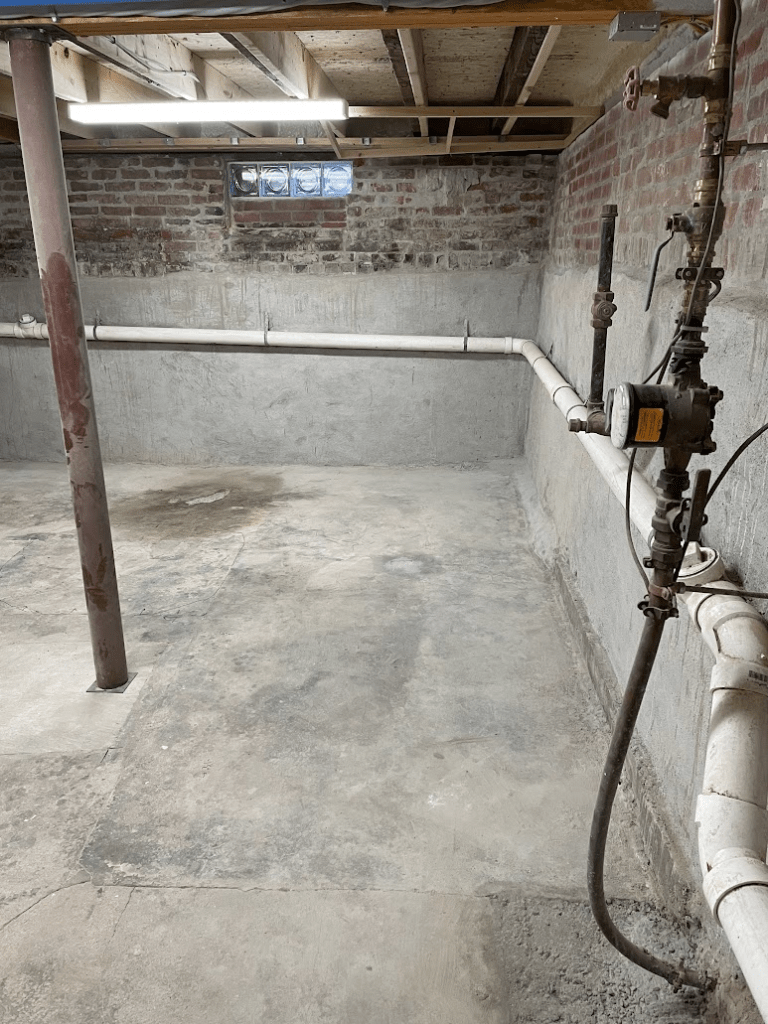 Note the stain on the floor above and on the bricks in the “before” picture is not water – it’s oil, from a massive oil tank that was removed when we switched over to gas.