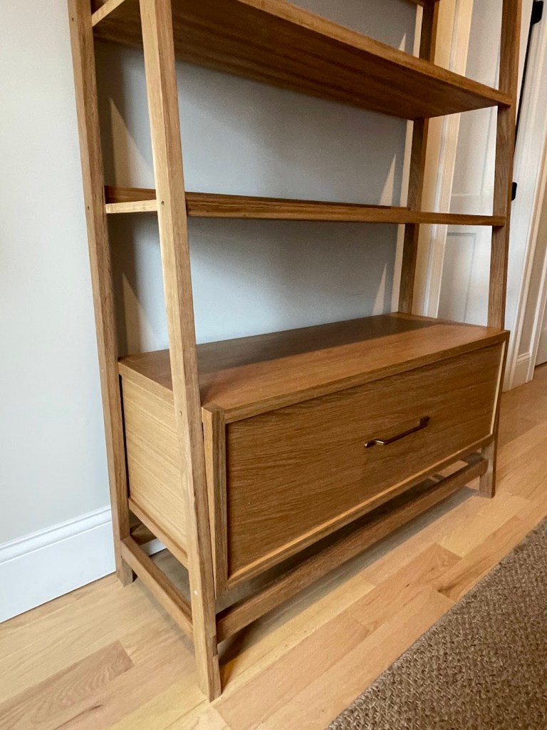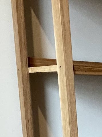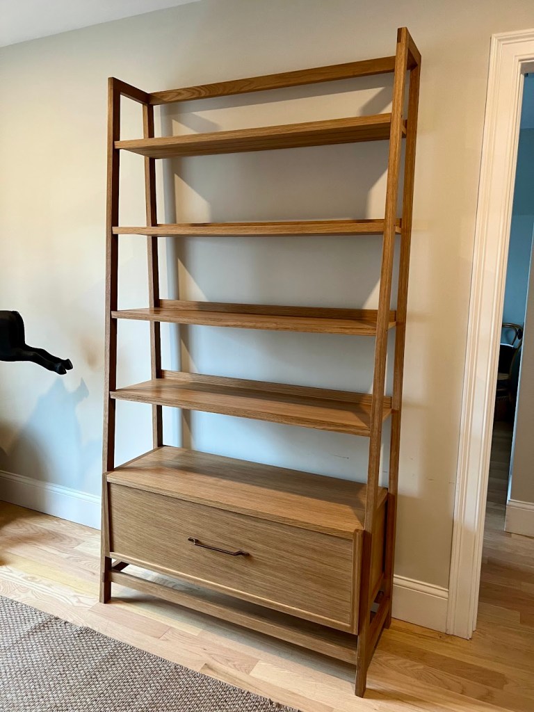 I ladder-style bookshelf for a neighbor comprising a solid oak frame, and quartersawn oak panels and hardwood edging for the shelves, and a large drawer a the bottom: