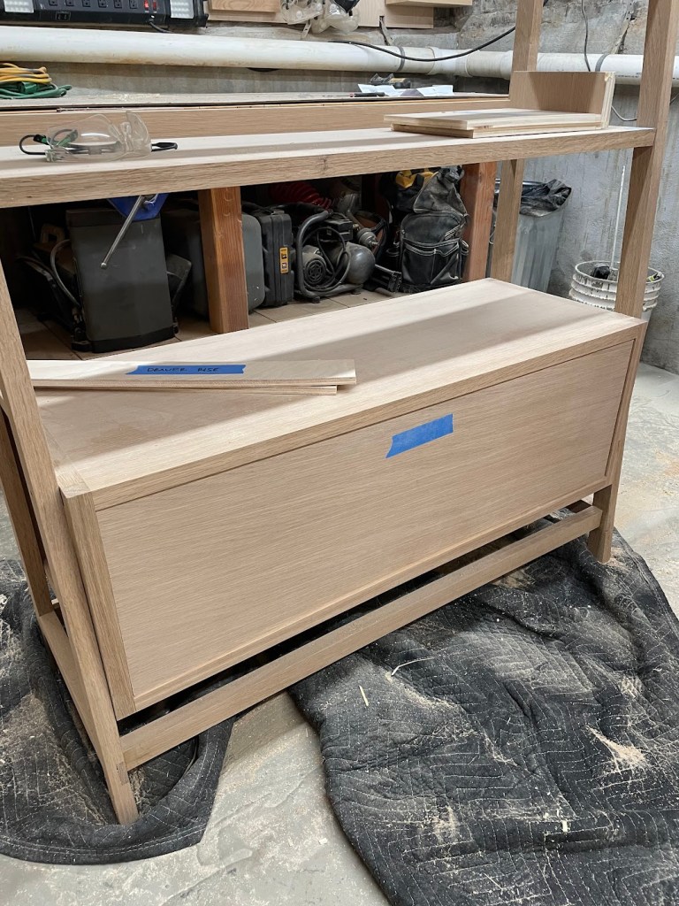 The frame itself is joined with half-lap joints and dowels; the shelves and drawers are simply attached via screws which were later covered by oak plugs in case the unit ever needs to be disassembled: