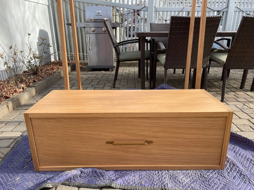 The drawer was made in my now-preferred style in which the frame is itself serves as the trim, and the panels are embedded, rather than the traditional approach of building a plywood box and adding trim afterwards. I also like having the panels inset, including the drawer front, which gives the box a nice symmetry around the front and the sides. Here it is outside on its way to the neighbor’s house:
